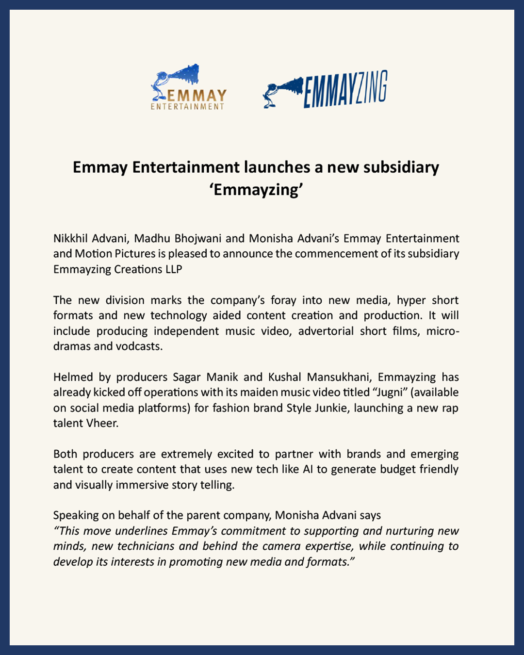 Established in 2011, Emmay Entertainment and Motion Pictures LLP is a leading content production company based in Mumbai, India. Founded by partners Monisha Advani, Madhu Bhojwani and Nikkhil Advani, the company has proven repertoire in full-length feature films and digital series. With an enviable body of work, Emmay has one of the largest slates of original fictional content across formats, with an organic bandwidth to keep expanding this capacity.